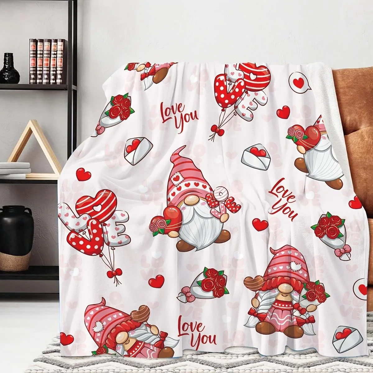 Flannel Blanket Multiple Sizes 2D Print Pink Gnome Heart Love You Phrase Red Hat Soft Warm Sofa Bed Office Camping Gift
